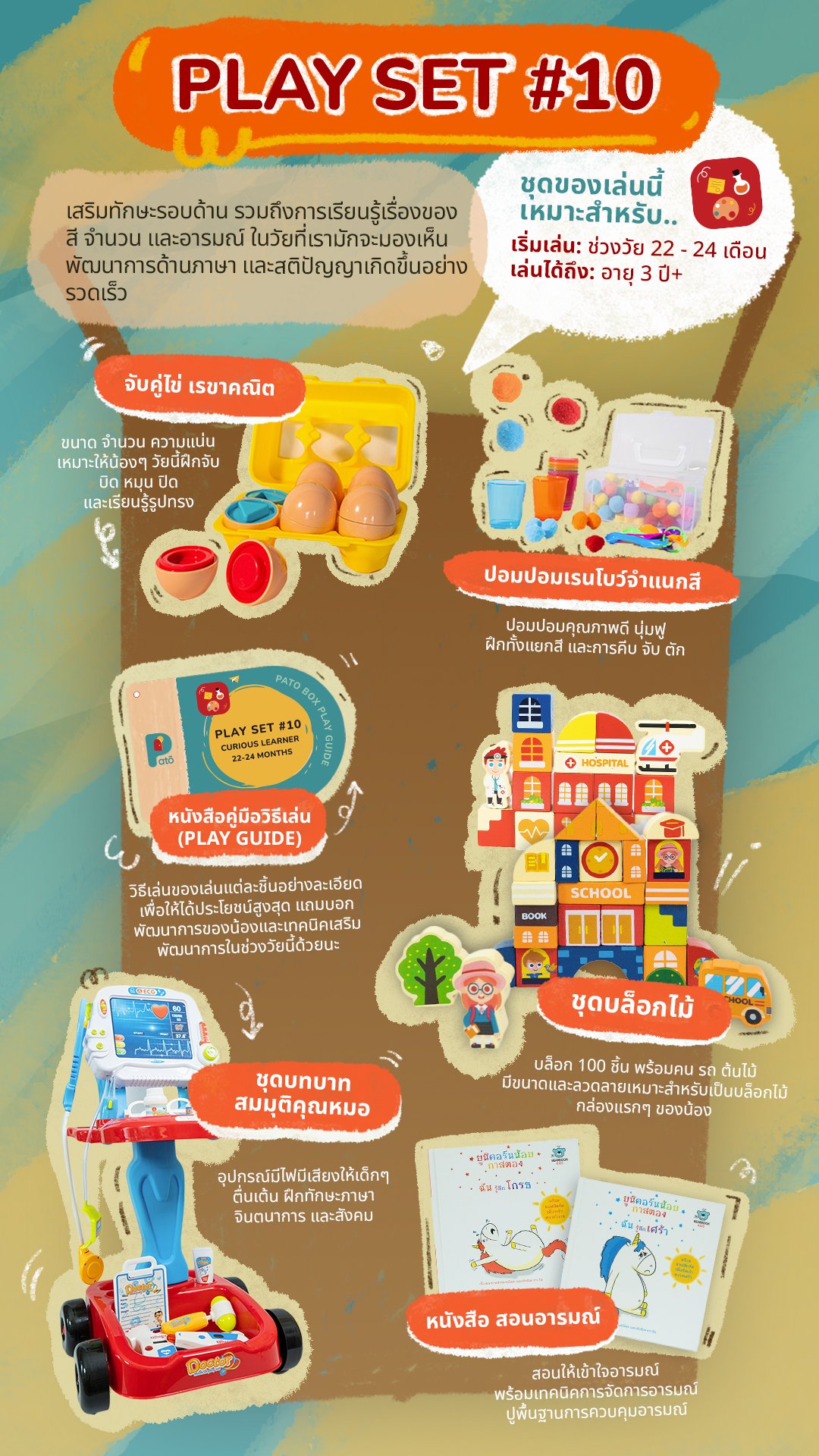 ชุดนี้เราจึงคัดสรรของเล่น ที่จะเปิดโอกาสให้น้องๆ ได้ทดลอง ทดสอบ และมีประสบการณ์หลากหลาย โดยมีของเล่นปลายเปิดหลายชิ้น ที่ให้น้องๆ ผสานจินตนาการไปพร้อมๆ กับการเล่นและการเรียนรู้ ไม่ว่าจะเป็นสี จำนวน รูปทรง การกะระยะ ฯลฯ มากไปกว่านั้น ยังมีนิทานที่ช่วยปูพื้นฐานการเข้าใจเรื่องของอารมณ์ ที่สำคัญต่อการเรียนรู้ที่จะควบคุมอารมณ์ของตัวเองในอนาคตด้วย